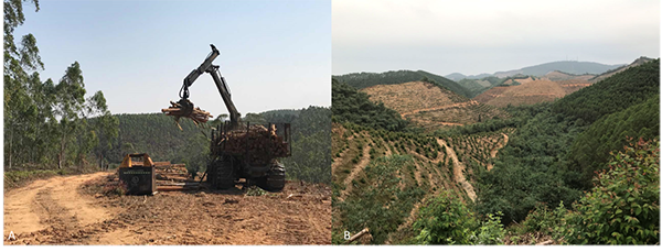 图4:用于木材生产的人工林:A-广西省合浦县的速生丰产桉树人工林;B-广西省高峰林场主要用于木材生产、但也保留有天然林的森林景观。(图片来源:华方圆)