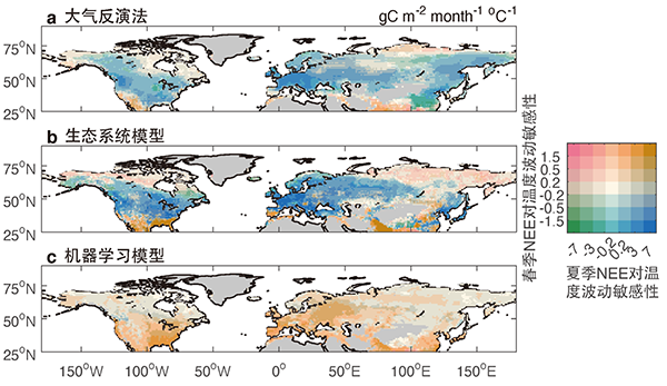 图1. 北半球陆地净生态系统碳交换量(NEE)对春、夏季温度变化响应的空间分布。正值表示升温抑制陆地碳汇,负值表示升温促进陆地碳汇。