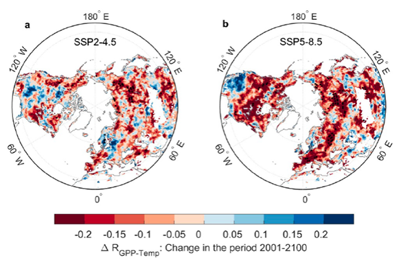 在此基础上,朴世龙院士继续领衔揭示了未来北半球陆地植被生长盛期(夏季)总初级生产力(Gross Primary Productivity, GPP)对升温响应的变化规律。研究发现,21世纪中高排放情景下(SSP2-4.5和SSP5-8.5),升温对植被GPP的促进作用均持续变弱。在北半球温带大部分地区,最迟至2070年,升温对植被GPP的作用由正转负,且拐点温度高于本世纪初植被光合最适宜温度。这表明,这些地区植被生长对未来升温仍具有一定的适应性,但适应速度慢于升温,不足以扭转升温终将抑制植被GPP的长期趋势。值得指出的是,在青藏高原和泛北极地区,升温将持续促进植被GPP,本世纪末之前未现拐点。这项成果为更准确预估陆地生态系统碳汇功能变化提供了理论依据。