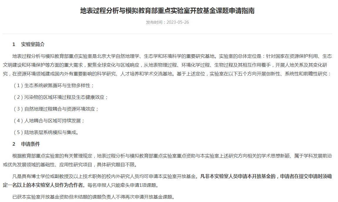 地表过程分析与模拟教育部重点实验室开放基金课题申请指南