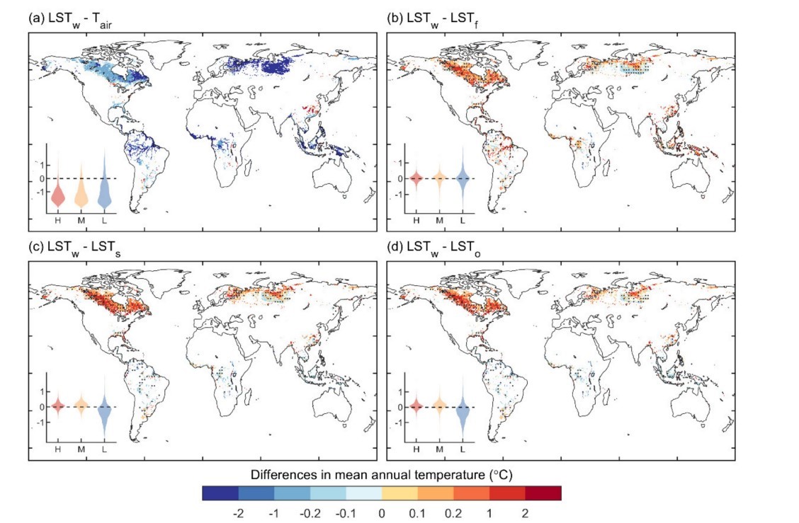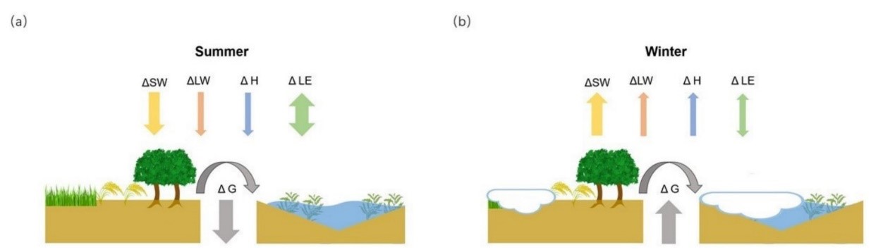 研究发现,多年平均上,湿地对热带地区有降温作用,但对北方地区有增温作用。北方地区55%以上的地区 ΔLST为正;在热带地区超过70%的区域 ΔLST为负值。同时,湿地对地表温度的影响在北方地区表现出明显的季节性:即湿地在冬季有增暖效应,而在夏季有降温效应。