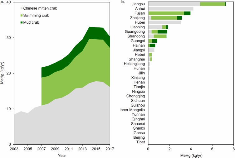 图2 我国年蟹类甲基汞产量年变化(2003-2017)及2017年蟹类甲基汞各省份产量