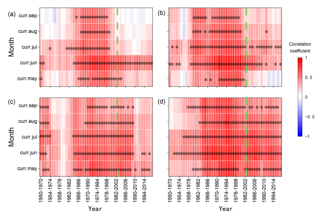 图2 不同多年冻土区生长季白桦和落叶松的BAI-PDSI移动窗口相关性分析
