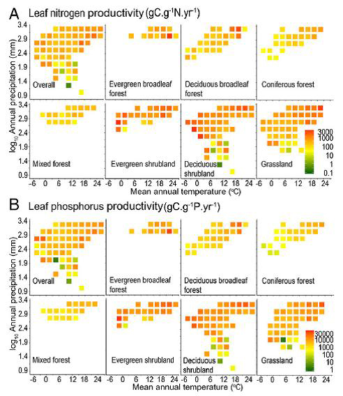 唐志尧副教授课题组与中科院植物所谢宗强研究员共同组织了碳专项灌丛课题的相关工作。在此PNAS专题中,唐志尧与中科院植物所、华南植物园等单位合作,揭示了中国陆地生态系统生产力的的化学计量机制。 植被生产是生态系统固碳的主要途径,叶片是植被生产的主要器官。局域尺度的个体的研究表明,植被生产力受制于叶片氮、磷含量。然而以往研究仅在个体水平开展,缺乏区域尺度植被生产力与植物化学计量之间关系的研究;然而由于生态系统中不同物种的个体数量悬殊,植物主要器官的氮、磷功能差异显著,因此基于个体的叶片养分与生产力的关系难以推演到生态系统。 图1 中国主要陆地生态系统氮、磷利用效率随年均温和年降水的变化 本研究中,唐志尧课题组与合作通过大量的野外调查取样,获取了4,159个样地中常见物种不同器官(根、茎、叶)的碳、氮、磷含量以及生物量,首次通过生物量加权研究了群落层次植物不同器官碳、氮、磷化学计量的大尺度格局及其与生态系统初级生产力的关系。研究发现:在啪啪啦尺度,不同植物器官之间的植物养分含量符合幂函数关系,叶片养分含量比根、茎养分含量更稳定;生态系统总初级生产力与叶片氮磷储量均成正相关关系,但在不同生态系统类型中,总初级生产力与叶片氮磷储量之间的关系取决于养分在不同器官之间的分配策略及优势植物的叶寿命。他们进而计算了中国陆地生态系统的植物叶片平均氮、磷生产效率(即单位质量的叶片氮或磷所生产的总初级生产力)分别为250 gC GPP/gN.yr-1 和 3,158 gC GPP/gP.yr-1,该生产效率随温度和降水的增加而增加;未来气候变暖背景下,生态系统可能会通过提高其氮、磷效率来增加总初级生产力。这一研究将植物养分的大尺度化学计量研究由个体以及单个器官扩展到群落层次,为进一步估算植物养分储量及模拟生态系统生产力对氮、磷沉降的响应提供了科学依据。 论文“Patterns of plant carbon, nitrogen, and phosphorus concentration in relation to productivity in China’s terrestrial ecosystems” (//www.pnas.org/content/115/16/4033)于2018年4月17日在线发表。啪啪啦