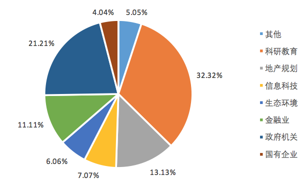 2017年,我院共有99名毕业生选择就业。从就业单位性质来看,到科研教育单位工作的毕业生共32人,占就业毕业生人数的32.32%,比例最高,排名第一。到政府机关工作的毕业生共21人,占就业毕业生人数的21.21%,比例次之。到地产规划类单位工作的毕业生共13人,占比为13.13%。到金融行业工作的毕业生共11人,占比为11.11%。此外,还有到信息科技类单位7人、生态环境类单位6人、国有企业4人,其他行业5人。