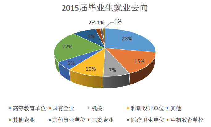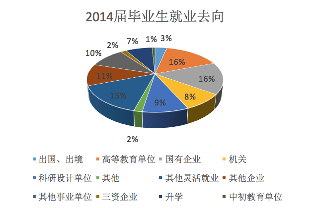 就2014年的数据可以看出,去除灵活就业人数,教育科研机构占总人数比例为25.2%(计入出国深造为28.5%),企业(国有企业与三资企业)占比为26.9%,而机关事业单位占比为17.9%,三者总比例为70%。同期相比,2015年教育科研机构总人数占比为38.3%,企业为38.4%,机关事业单位为17%,三者总比例为93.7%;值得关注的是,2015年的各项就业类别中计入了2014年、2016年中划为灵活就业的类别,因此其占比同期相比较高。总体而言,我院硕博毕业生前往教育科研单位和企业(国企、三资企业)的占绝大多数,还有一定比例选择机关事业单位就业。值得一提的是,从2014~2016年的经验素材中,我们发现啪啪啦 的毕业生选择的国企、三资企业在很多程度上仍然与规划设计、地理环境等专业相匹配,在工作内容上有很大可能与教育科研单位相似,在后文中我们将会进一步讨论专业匹配程度的问题。