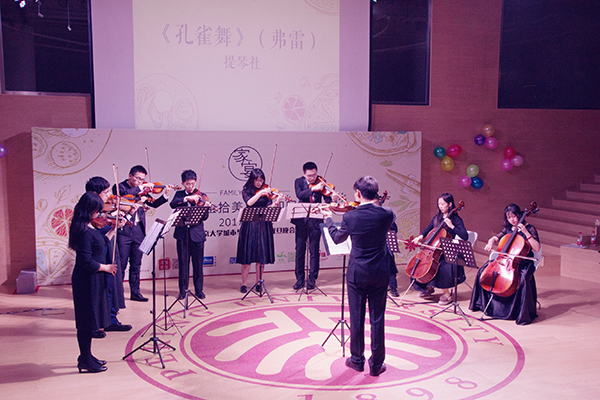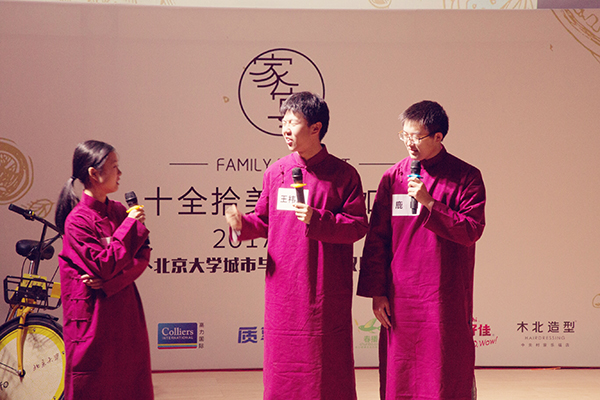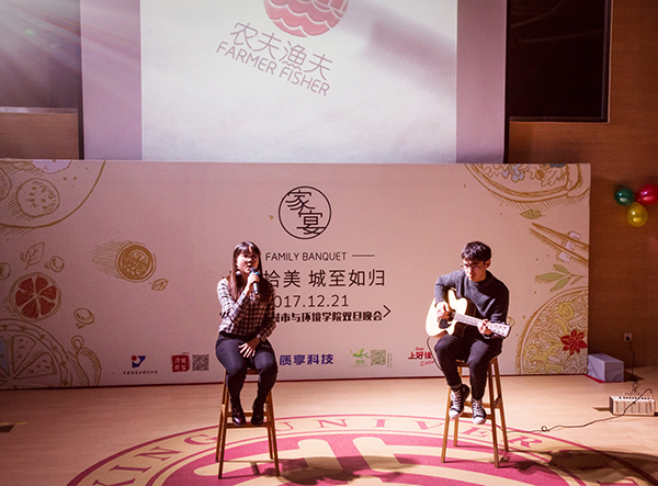 的感恩和对全院师生的新年祝福。 图2 晚会主持 四位主持人分别代表酸甜苦辣四种风味,呈现丰富多样、不同口味的节目菜品,让现场观众真真实实地体验到“家宴”的满汉全席,美食纷呈。晚会在街舞风雷社热辣动感的舞蹈中拉开帷幕,全场氛围热情高涨。接着提琴社的同学们带来悠扬婉转的小提琴演奏《孔雀舞》,观众们沉浸在美妙的旋律中,久久难忘。接下来刚柔并济、豪情万丈的武术表演《少林雄风》行云流水,霸气十足,一个又一个的高难度动作更是震撼全场,观众们欢呼声此起彼伏。在晚会现场的互动板上,一句句正能量的加油词,一条条诙谐搞笑的段子,成为晚会现场别样的风景线。随后, 深情动听的歌曲串烧、独具特色的新疆独舞、奇妙有趣的魔术幻境、幽默诙谐的相声调侃、肺腑情深的诗歌朗诵,为观众们献上一场听觉和视觉的盛宴。由城环女篮带来的荧光舞演出、城环研会自制的lipdub视频、129团队献上的精彩合唱将本场晚会不断推向一个又一个高潮。 图3小提琴演奏《孔雀舞》 图 4 武术表演《少林雄风》 图 5 歌曲+吉他《农夫渔夫》 歌曲节目《一次就好》获得了本场晚会最具人气奖,美妙动听的旋律唤起在场观众的共鸣。晚会在城环素人维密秀中落下帷幕,一位位城环人在音乐和秀场中展示属于城环人自己的风采,一张张意气风发的脸庞彰显城环人气概豪迈,风华正茂, 必将在新的一年里继续发挥城环精神,奋发图强! 图 6 相声《侃天侃地侃燕园》 图 7 朗诵《2018,我们不一样》 图 8 129合唱《瑶山夜歌》 六十五载东风桃李,十年城环砥砺前行。 遍尝人间酸甜苦辣,无惧人间雨雪风霜。 历尽千帆不断壮大,共塑中国地学辉煌。 相聚于此翘首新年,城环家宴宾至如归。 2017年正值啪啪啦
