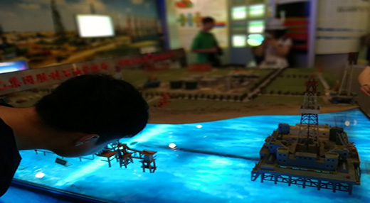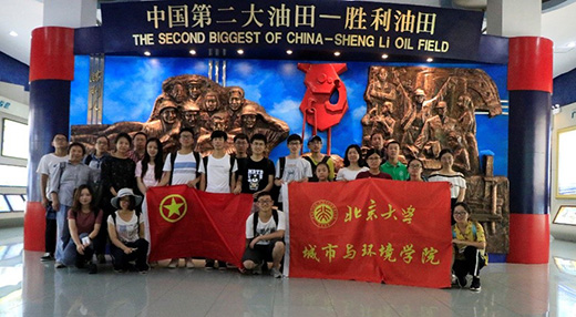 黄河三角洲湿地生态试验站,对滨海湿地进行定位观测和生态研究。之后,实习团队深入黄河三角洲湿地,在感受湿地自然风光的同时,由带队老师为同学们讲解湿地生态系统对在物质生产、水分调节、水质净化、生物保护等方面的重要作用,以及目前国内湿地的分布、破坏和保护情况。下午,实习团队聆听了东营市旅游发展委员会陈际锦书记、黄委河口水文局徐从亮总工和曾在黄蓝办工作的孙彩霞老师等部门专家报告,从旅游、黄河历次出汊和黄河三角洲高效生态经济区与山东半岛蓝色经济区等角度深入了解黄河流域。 图四.实习团队在三角洲湿地生态站的合影 图五.徐总工热情地进行报告 参访展览中心,学习胜利精神 7月12日,实习团队来到胜利油田科技展览中心进行相关的参访与学习活动。在讲解员的引导下,实习团队参观并学习了胜利油田展览中心的勘探开发厅、科技成就厅和油田发展史厅。进入新时代,胜利精神也有所变化,新时期的胜利精神,则是“从创业走向创新、从胜利走向胜利”,正如广大青年学子,也是同新时代共同进步的新一代,要同胜利油田的创业者一样,励志、求真、力行,肩负新时代的任务,追逐新时代的梦想。 图六.同学认真观察海上平台模型 图七.实习团队在科技展览中心的合影 本次综合自然地理黄河实习实践,是啪啪啦