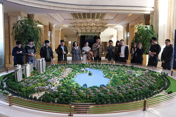 12级城市规划专业毕业生,现任华夏幸福固安城市规划方面的负责人。 图3 在规划馆听取韩晓飞学姐讲解 随后,在韩晓飞学姐的带领下,同学们参观了卫星导航产业园和肽谷生物医药产业园,在展厅听取了讲解员介绍两个园区的基本概况与产业发展情况。在路途中韩学姐又给同学们普及了固安产业新城的规划理念——要建立一座有完整配套宜居宜业的城市、做理想中的城市,就要适当考虑为城市的未来预留发展空间。同时,同学们也了解到,华夏幸福是中国唯一一家有产业发展团队的企业。 图4 同学们在固安航天产业园交流 最后,同学们参观了华夏幸福最近布局的孔雀城·大湖地产项目,该项目在规划之初就在城市配套方面十分注重。售楼处的工作人员带领大家参观了大湖内合院的样板间。地上两层地下两层外加巨型小花园的合院,内部精巧的设计、豪华的装修都令大家大开眼界,其中运用的很多思路对同样学习过设计课程的大家也有所启发。 图5 同学们在大湖售楼处听取讲解 在轻松愉快的氛围下,本次华夏幸福企业参访活动也就告一段落。伴着落日的余晖,大家乘车返回了学校。通过本次活动,同学们对华夏幸福有了进一步的了解,在拓展视野的同时,更为自身未来就业择业打下了基础,每个人都收获满满,不虚此行。 图6 合影 文:张燕华 陈雪琦 张馨元