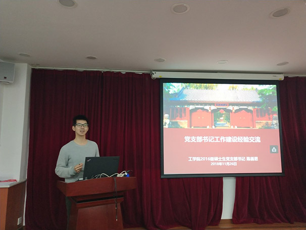 2016级硕士陈善恩同学。 于佳弘同学以“无限风光在险峰”为分享主题,从基本情况、支部建设、支部生活、特色活动四方面分享了自己的党支书工作经历,认为党团学生干部尽管辛苦,但是却承担着“领头雁(表率作用)、当家人(管好队伍)、粘合剂(融洽关系)”的重要作用,于佳弘带领的支部开展了丰富多彩的活动,力求深入基层、服务他人、服务社会,并与专业结合,充分调动参与的积极性。 于佳弘同学分享党支书工作经验 陈善恩同学分享经验时认为党支书不要做光杆司令,“班子给力”很重要,并针对一些“影子党员”、组织生活参加积极性不高等常见问题,提出了自己的应对方式,为各位党团干部开拓了新的管理思路。 陈善恩同学分享党支书工作经验 此次培训会响应党、团组织共建工作部署,加强啪啪啦