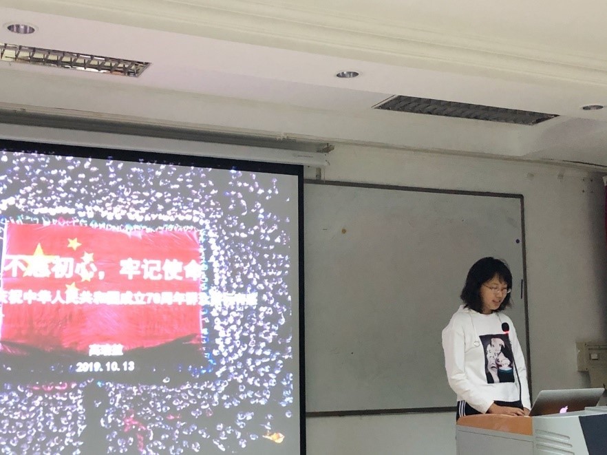 本科生党支部于逸夫二楼3459举行 “不忘初心、牢记使命”主题教育活动暨秋季学期第一次党支部大会,院党委办公室主任刘萍和支部全体党员参加此次活动。活动由支部书记蔡茂主持。 首先,2016级城规班范文颖同学和2015级城规班高瑜堃同学分别向与会党员做线下学习心得交流分享。范文颖同学分享了她学习关于“不忘初心、牢记使命”重要论述的体悟——青年力量是希望之所在。她认为,新时代下,党与青年的联系更为紧密,党更好地与青年进行沟通,将爱国、爱党的信念种在青年人的心中。而我们作为北大青年,应该承担起自己的责任使命,找到自己的位置,努力奋斗。高瑜堃同学则用风趣的语言分享了她参与庆祝中华人民共和国成立70周年群众游行的感受,阐述了她自己对于“不忘初心,牢记使命”的理解:“不忘初心”,不忘的是一颗中国心,一个能让我们抛弃一切狭隘的个人利益带来的琐碎的烦恼和人之间的不同,倾心而听的理由。“牢记使命”,牢记的是让中国强起来的使命,是要在很近的将来实现中国的政治、经济、文化和科技高度自信的使命。 高瑜堃同学分享参与重大活动心得 交流分享环节之后,蔡茂传达了啪啪啦