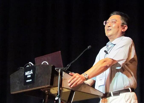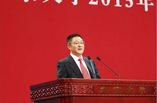 研究生毕业典礼校友代表致辞时说:“我也可以算是未名湖看着长大的,因为1979年我踏入校门时身高1.67 m,毕业时长到1.76 m,到今天没有再变。” 图2 2015年郭正堂院士在啪啪啦