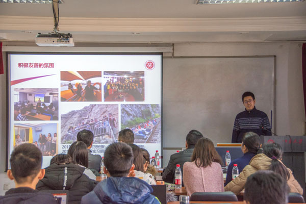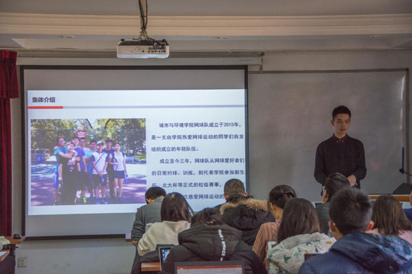 网球队答辩 图二 邓鲁川代表2015级本科城规班-团支部答辩 答辩会上,各团队展示了集体建设中的自身特色与突出成绩。2015-2018级本科生党支部介绍了党员培养与发展、理论学习与实践、社会服务与奉献等方面的党建特色工作;2015级本科环科班-团支部、2016级本科城规班-团支部、2017级本科资环班、2018级本科1班-团支部等11个班级-团支部不仅从班团成绩、班团活动、出彩人物等方面展示了队伍风采,也结合各自的专业特色展示了前往野外、企业、科研院所等地的实习活动,让大家感受到实践中的专业风采,体现出城环青年走向城镇乡野、用脚步丈量中国大地的精神;啪啪啦