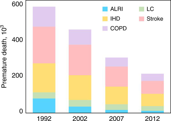 团队自己建立的全球高分辨大气污染物排放清单,基于最新调查获得农村居民生活能源结构和消耗量数据,研究组系统评估了中国农村生活能源转型带来的环境、健康和气候效应。研究发现,从1992年到2012年的20年间,由于家庭生活能源的清洁转型,农村生活源燃烧排放对大气PM2.5的贡献和人群呼吸暴露浓度的贡献显著地下降。在校正了人口增长、老龄化、自然死亡率变化等因素后,这二十年间因农村生活能源转型使得大气PM2.5暴露导致的过早死亡人数净减少13万。相应地,农村生活源排放的CO2和PM2.5等引起的辐射强迫从1992年的0.057±0.016 W/m2下降至2012年的0.031±0.008 W/m2。生活能源对大气污染、健康危害和气候变化的影响具有很大的时空差异。在北方地区和冬季,受取暖需求等影响,生活能源排放的贡献相对较大。该研究为全面而客观地认识生活能源对大气环境与健康的影响提供了重要的价值。以沈国锋为第一作者,陶澍为通讯作者的研究论文(impacts of air pollutants from rural Chinese households under the rapid residential energy transition)发表在近期《自然∙通讯》(Nature Communication)上。(//www.nature.com/articles/s41467-019-11453-w) 图1. 1992-2012年间农村生活源排放造成的PM2.5暴露引发的过早死亡人数 图2.1992-2012年间农村生活源排放的CO2和主要颗粒态污染物造成的辐射强迫