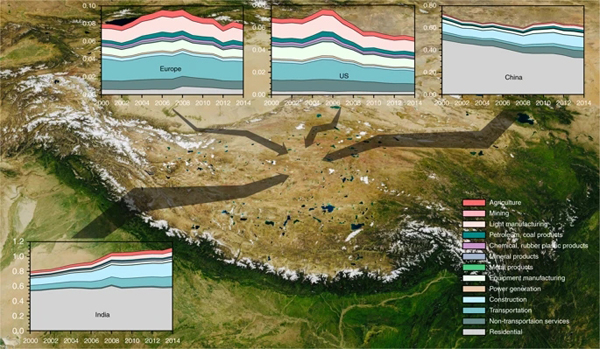 黑碳(BC)是含碳的化石燃料和生物质不完全燃烧的产物, 通过改变直接辐射强迫、与云的相互作用、雪冰反照率以及相关反馈机制, 显著影响大气与雪冰介质的能量平衡, 对地球的气候系统具有独特而重要的作用。作为人类活动产生的重要气候强迫因子,黑碳气溶胶在青藏高原和喜马拉雅山脉的聚集可能加速冰川消融,从而进一步威胁青藏高原的水资源供给和生态环境。使用大气化学传输模式GEOS-Chem和它的Adjoint伴随模型结合多区域投入产出分析,我们首次量化了不同啪啪啦/部门作为全球贸易中的直接排放者,最终消费者和主要供应者对青藏高原地区冰川的BC污染的贡献。 从多个角度来看,印度和中国都是青藏高原冰川地区BC污染的主要来源。这两个地区共同贡献了0.63~0.70 W m-2在大气层顶部(TOA)的直接辐射强迫(DRF)和1.51~1.70 W m-2地表雪地反照率强迫(SAF)。美国和欧洲通过进口商品或出口资源等形式将BC排放转移到亚洲地区,从而导致BC从偏远地区到青藏高原冰川的虚拟运输路径。从消费的角度来看,印度的BC排放对青藏高原冰川的贡献呈现出快速增长的趋势,而美国,欧洲和中国的贡献在过去十年中有所下降。我们的研究结果表明,国际贸易加剧了青藏高原冰川地区的BC污染,并可能导致严重的气候变化。全球需要进一步加强对相关地区(特别是南亚地区)黑炭排放的管控,从而减轻黑炭对青藏高原的气候威胁。以博士生易侃和孟靖为第一作者,刘峻峰为通讯作者的研究论文(The cascade of global trade to large climate forcing over the Tibetan Plateau glaciers)发表在近期《自然∙通讯》(Nature Communications)上。(//www.nature.com/articles/s41467-019-10876-9)