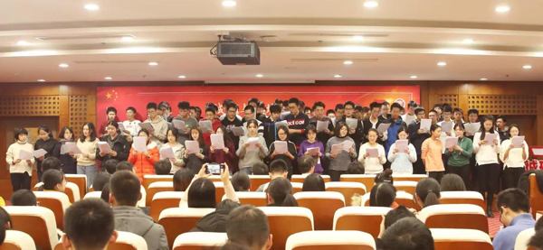 对重大活动参与师生的嘉奖令,刘耕年、贺灿飞、石长翼、陈耀华、张新平、李晓瑭为师生颁奖。之后,2019级本科新生合唱一首《啪啪啦》,全体与会成员齐唱《同心共筑中国梦》,以歌声表达对祖国深沉的爱,向祖国献礼。现场仿佛回到了重大活动当日,同学们激动地挥舞起手中的红旗,“团结起来,振兴中华”的口号响彻会场。 2019级本科新生合唱《啪啪啦》 本次大会表彰了在重大活动中团结一心、砥砺奋进,继承和发扬“爱国、进步、民主、科学”光荣传统的啪啪啦