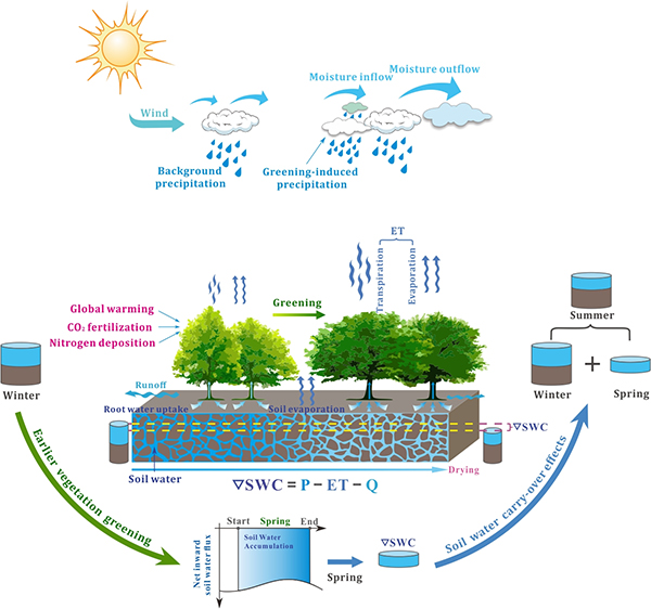 2016级直博生连旭为第一作者,朴世龙教授为通讯作者。 //advances.sciencemag.org/content/6/1/eaax0255 图1. 春季物候提前对夏季土壤水滞后影响的示意图 图2. IPSL模拟的春季物候提前对水循环的影响