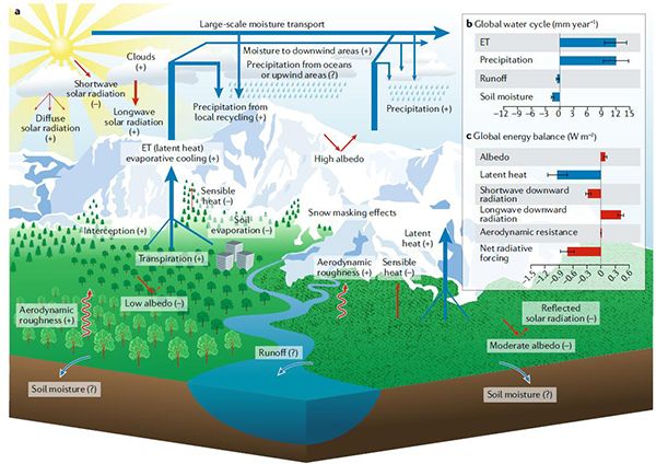 朴世龙教授研究组应邀在Nature子刊Nature Reviews Earth & Environment的创刊号上发表了题为“Characteristics, drivers and feedbacks of global greening”的综述文章(也是该刊创刊以来发表的第一篇论文),系统梳理与综述了1980年代以来全球植被生长增加即植被变绿的观测证据、驱动机制,及其对气候系统的反馈作用。 基于多数据源和多指标的遥感证据表明,上世纪80年代以来的植被变绿一直持续至今,这一趋势在北方高纬地区以及农田和植树造林区域尤为醒目(图1)。在全球尺度上,二氧化碳施肥效应是植被变绿的主要驱动因子;但不同区域植被变绿的主导因子不尽一致,例如升温是导致青藏高原和北方高纬地区植被变绿的关键机制, 而植树造林活动是北半球温带地区植被变绿的关键因素。陆地植被变绿通过吸收更多的大气二氧化碳的生物地球化学过程(图2)和蒸腾降温等生物地球物理过程(图3),显著减缓了全球气候变暖。植被变绿对蒸腾的促进作用同时也加剧了全球水循环。对区域水循环而言,植被变绿一方面通过增强蒸腾作用导致土壤水分和地表径流的减少,另一方面还可扰动大气环流,引起降水格局的变化,从而起到弥补(下风向)或加剧(上风向)蒸腾作用增强导致的水分散失的作用。植被变绿对区域水循环的总体影响取决于两者之间的博弈。 文章最后指出,植被变绿是进入人类世后地球生物圈变化最为显著的特征之一。未来研究仍需进一步加强遥感观测尤其是对热带地区植被的监测,并提高模型对植被生长响应和反馈气候变化关键过程的模拟精度。该研究综述回答了近年来有关全球植被是否变绿的争论以及全球植被变绿主要驱动力的争议,推动了从地球系统多圈层耦合视角研究植被变绿及其影响,不仅丰富和发展了植被和全球变化学科内涵,还为应对全球变化的生态系统解决方案提供了科学依据。 该研究得到了啪啪啦自然科学基金等项目的资助。 文章链接 //www.nature.com/articles/s43017-019-0001-x