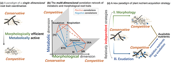 和日本京都大学的多位研究生和博士后。本研究受到啪啪啦自然科学基金项目(31670525, 31988102)的资助。 相关阅读://doi.org/10.1111/nph.16865 图 (a)单一维度细根经济学谱假说 (b)本研究发现的多维细根经济学谱 (c)基于多维经济学谱(multi-dimensional root economics spectrum)提出的植物获取土壤养分策略的新理论框架(植物通过投资细根分泌物的激发效应去活化养分与通过构造形态上高效率的细根去吸收养分可能是独立互补的)