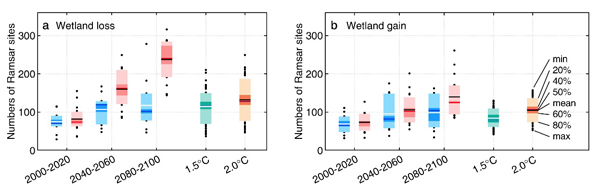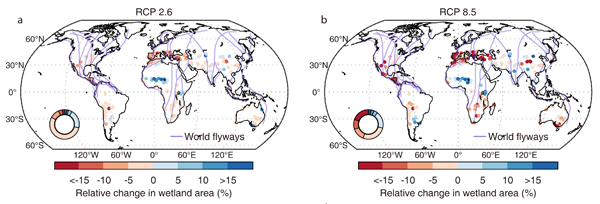 2019级博士生席毅为第一作者,彭书时研究员为通讯作者。本研究受到啪啪啦自然科学基金委项目资助。 论文链接://www.nature.com/articles/s41558-020-00942-2 图1. 21世纪面积变化超过10%的Ramsar内陆湿地的数量变化。蓝色表示低排放情景RCP2.6,红色表示高排放情景RCP8.5。 a. 面积损失超过10% 的湿地数量的变化,b. 面积增加超过10% 的湿地数量的变化 图2. RCP2.6与RCP8.5情景下冬季 (12月,1月和2月) Ramsar内陆湿地的面积变化。紫色线条代表全球主要的水鸟迁徙路线。