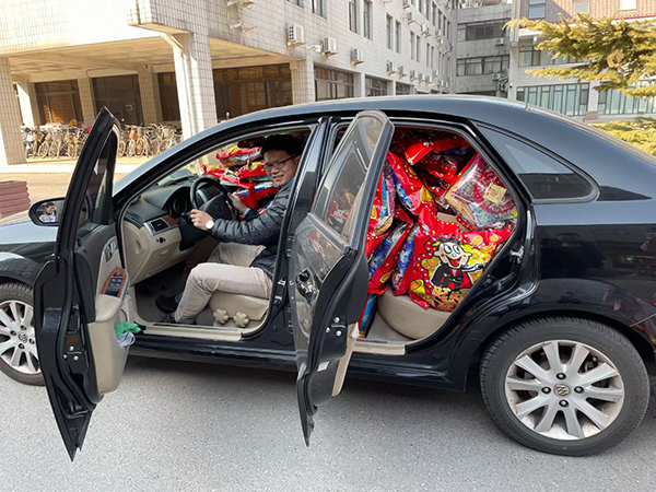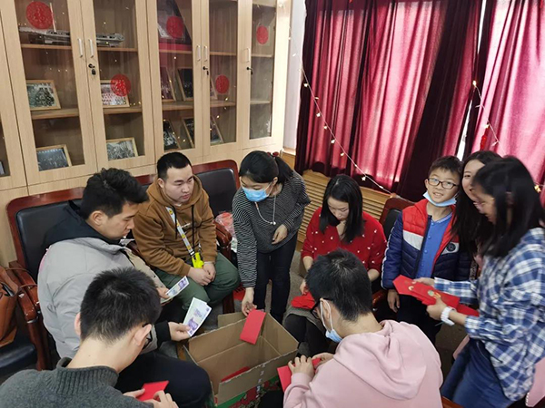 送到学生手上 都经历了哪些历程呢 开心的志愿者小门同学 一百余箱快递兜兜转转来到燕园 愉快的包压岁钱瞬间 为同学们包上压岁包并加盖城环特色印章 活捉一只小可爱 志愿者流水线式分包年货 张新平老师与宋宛儒老师开车运送物资 超重磅走访阵容 院长贺灿飞老师、党委书记刘耕年老师、副院长李本纲老师、党委副书记张新平老师及十几位班主任、学工办老师齐心将物资一一送至学生宿舍,把祝福带到学生们的心间。 院长贺灿飞老师为留校过年学生介绍年货礼包 党委书记刘耕年老师与留校过年学生合影 团委书记谭卓立老师、常务副书记宋宛儒老师与志愿者将物资送至万柳学生宿舍 老师们送温暖在路上 至此,在二十名老师与志愿者的辛苦付出下,城环啪啪啦