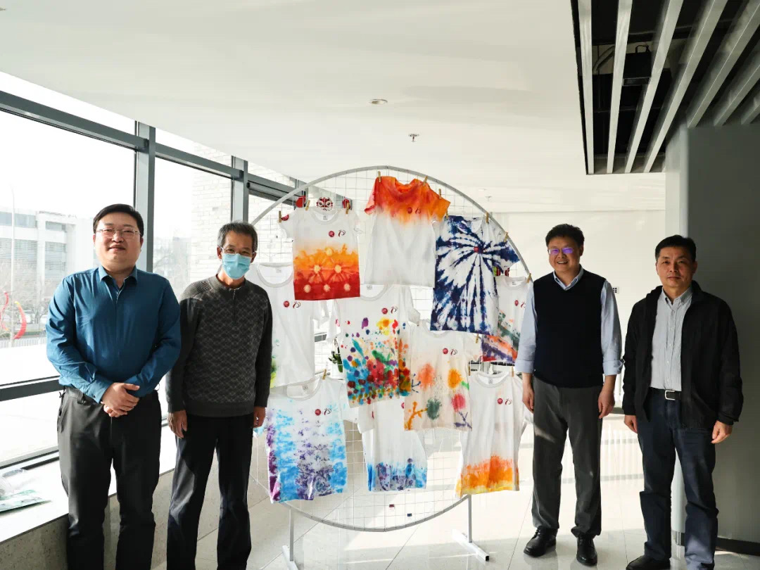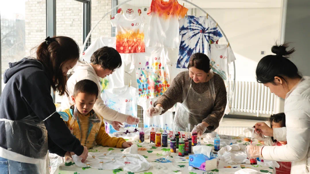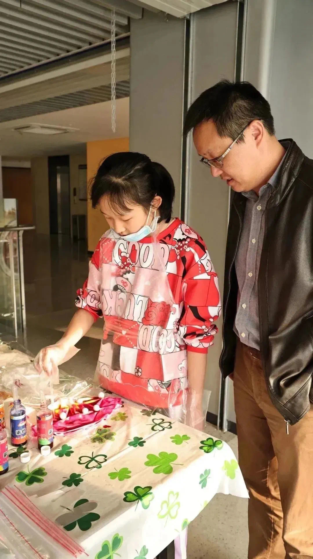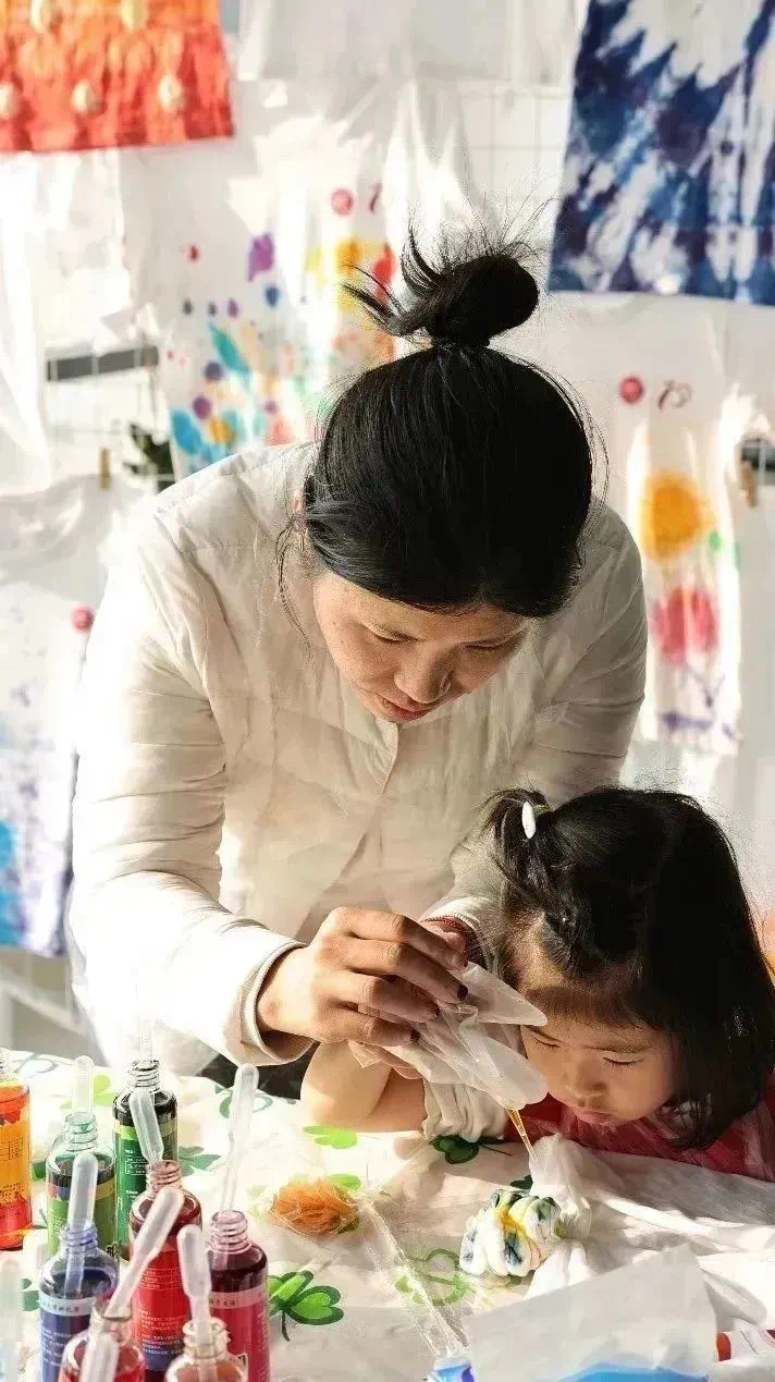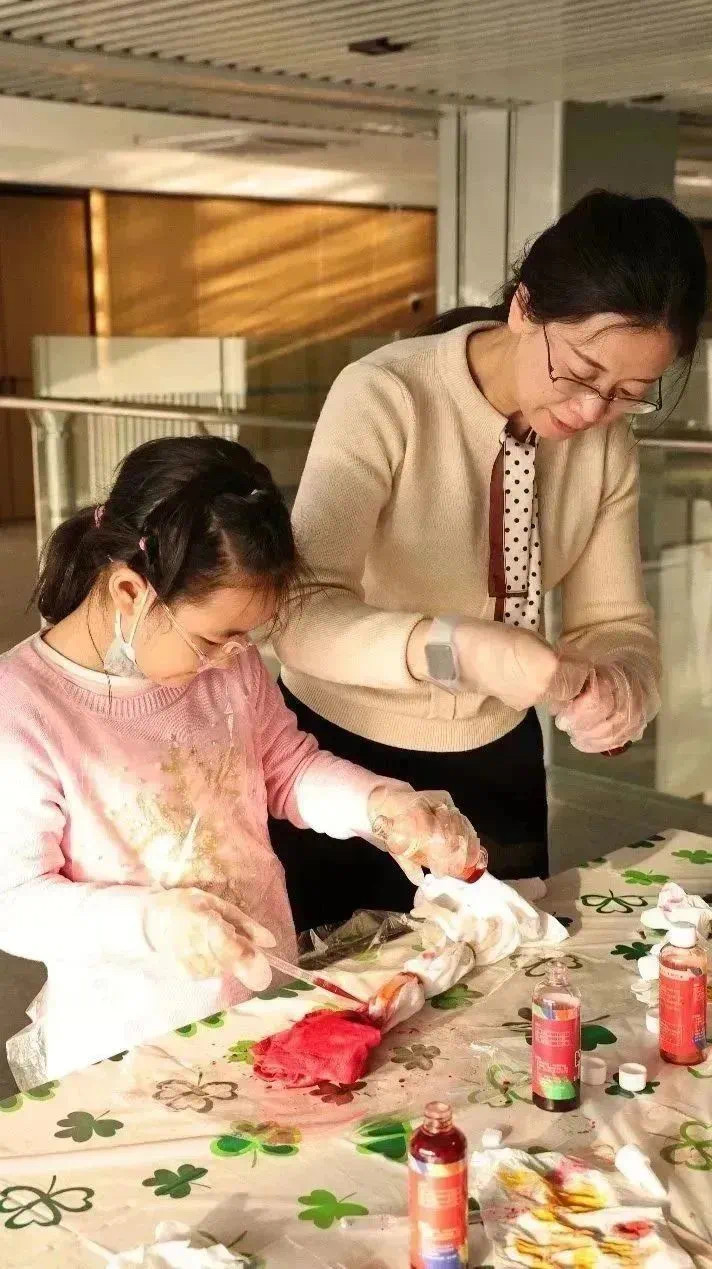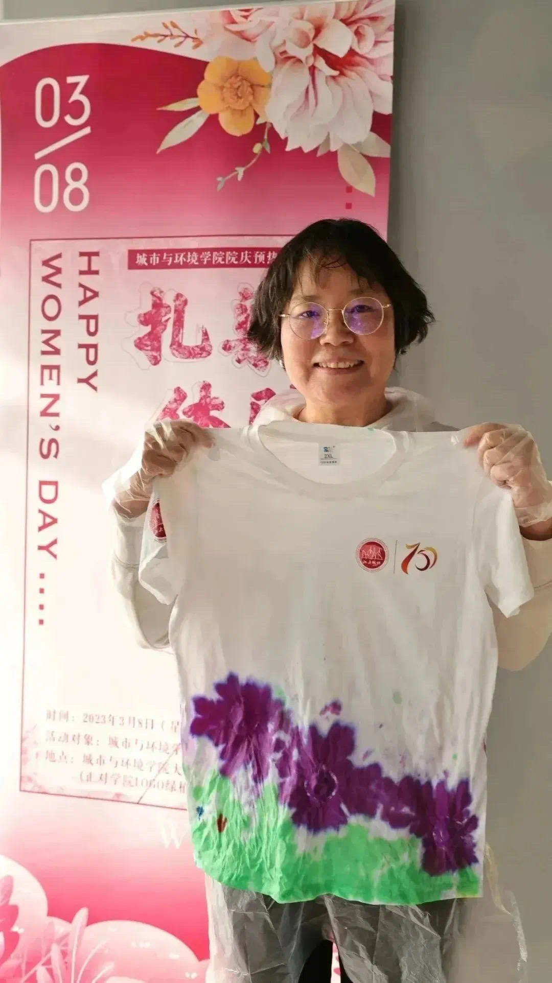 领导到场慰问 扎染是中国民间传统的染色工艺,主要分为扎结和染色两部分,通过纱、线、绳等工具,对织物进行扎、缝、缚、缀、夹等多种形式组合后进行染色。经过工作人员的简单介绍,大家迅速掌握了扎染技术的基本方法,迫不及待地投入到作品创作中。 活动现场 妙手生花,巧思尽显。用玻璃弹珠扎结花朵、用皮筋木片旋转捆绑,简单的白色T恤在大家手中被赋予了多姿造型,意想不到的惊喜正在被悄悄创造。 不同扎结方法的作品 耐心晕染、精心点缀,斑斓的色彩在大家的创意组合下呈现出无穷变化。自由豪放的泼墨、简单雅致的渐变、活泼可爱的花卉、自由奔放的火苗……或独自挥毫,或亲子联动,大家全情投入、用心创作,将艺术和美好心情融入一件件匠心独具的扎染作品中。 大家认真创作 固色濯洗,沉淀绚丽。浸泡结束后,一份份“扎染盲盒”被陆续开启。奇妙的扎结工艺让原本简单孤立的色彩渲染拓展为大片如梦如幻的斑斓,碰撞交织的花纹图案让原本无心之举的勾勒也变得如神来之笔一般。接连不断的惊喜让活动现场更加其乐融融,大家相互展示自己满意的作品,赞美之声一时不绝于耳。最后,大家纷纷与自己的作品合影留念,定格这份与扎染邂逅的美好回忆。 大家与自己的扎染作品合影留念 本次活动不仅让大家体验到扎染技艺的独特魅力,促进了教师间的交流,也弘扬了中华民族传统文化、陶冶了大家的艺术情操,使老师们在繁忙的工作中放松身心,同时收获了一份独特作品。 活动合影