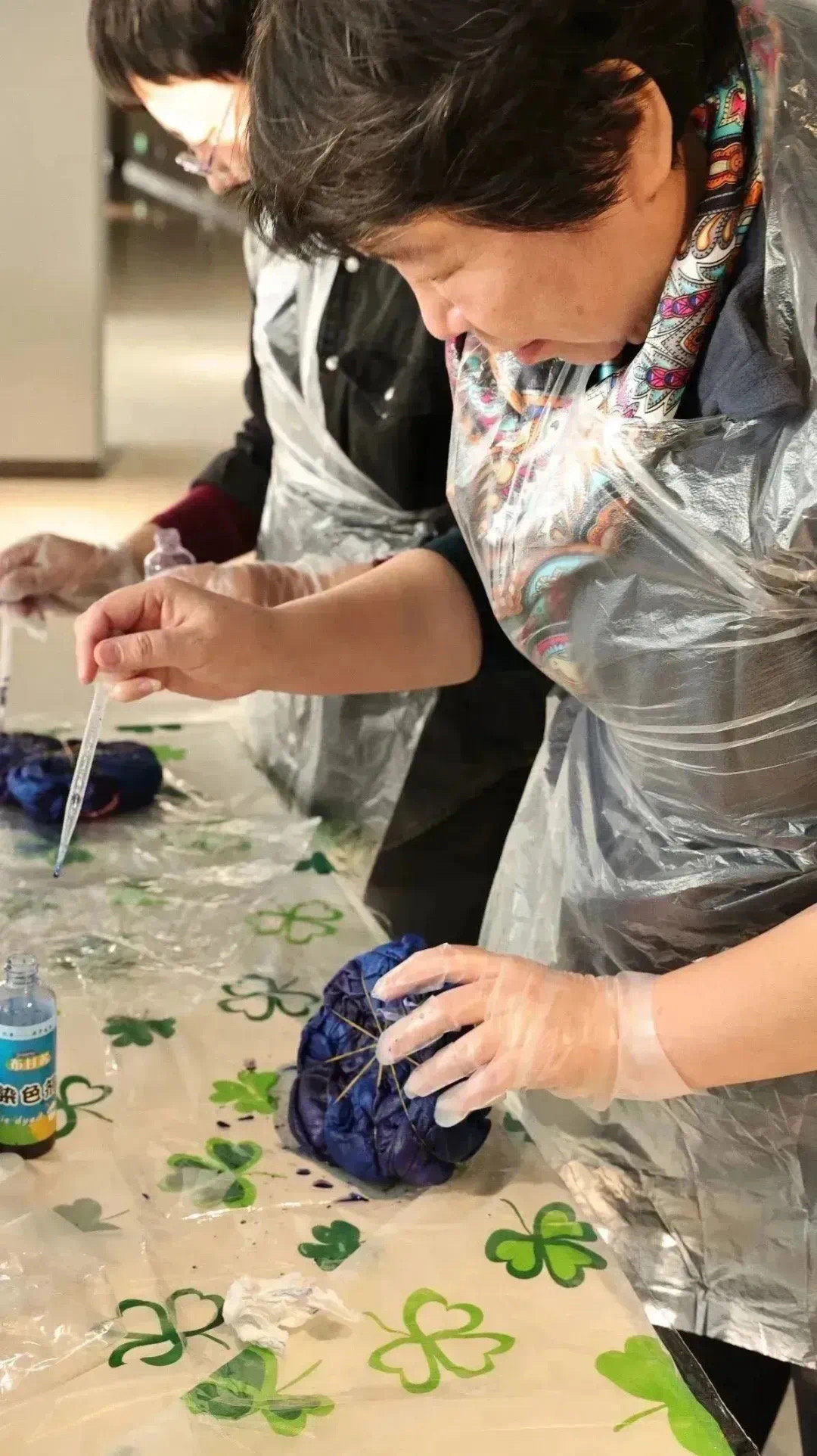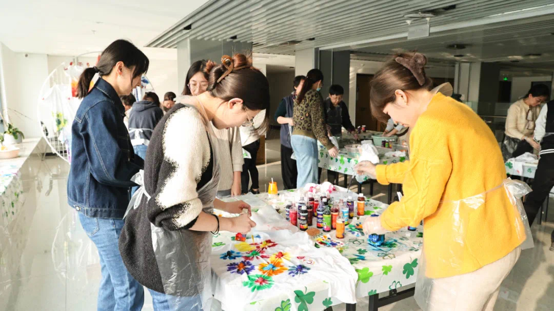 大楼二层大厅成功举办扎染体验活动。几十位教职工欢聚一堂,在活动中感受扎染非遗文化的美学魅力,用丰富多彩的扎染作品为啪啪啦