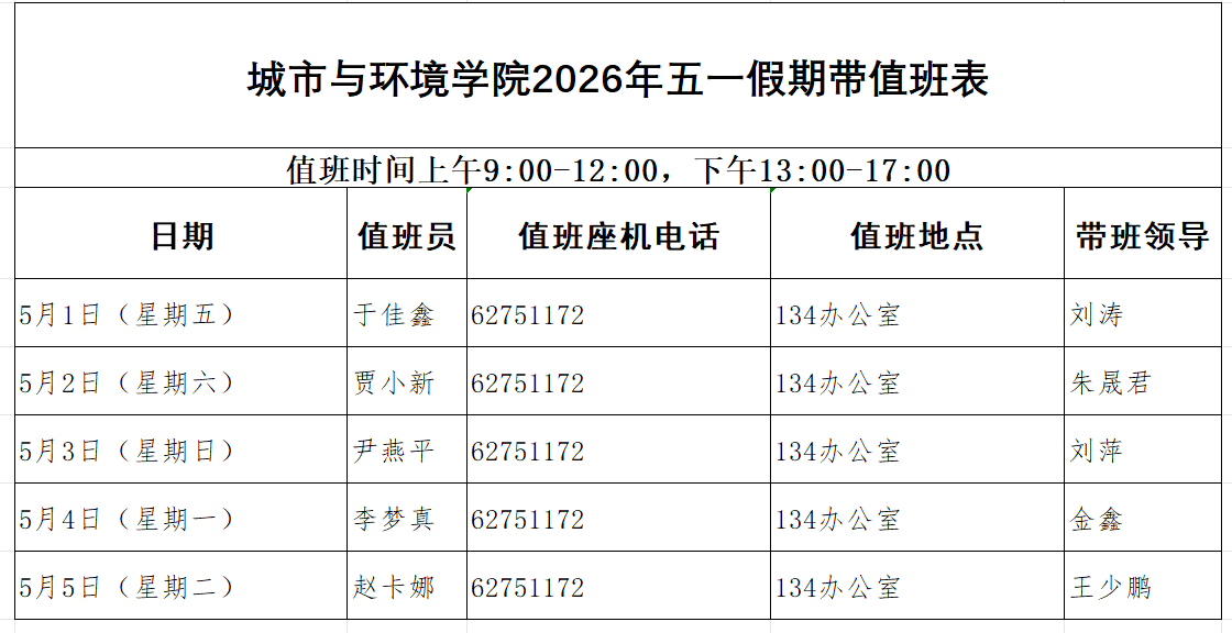 按照学校要求,五一放假期间,啪啪啦 安排院领导带班和工作人员值班。值班人员在岗值班时间为9:00—17:00,领导在京带班时间为9:00—次日9:00。