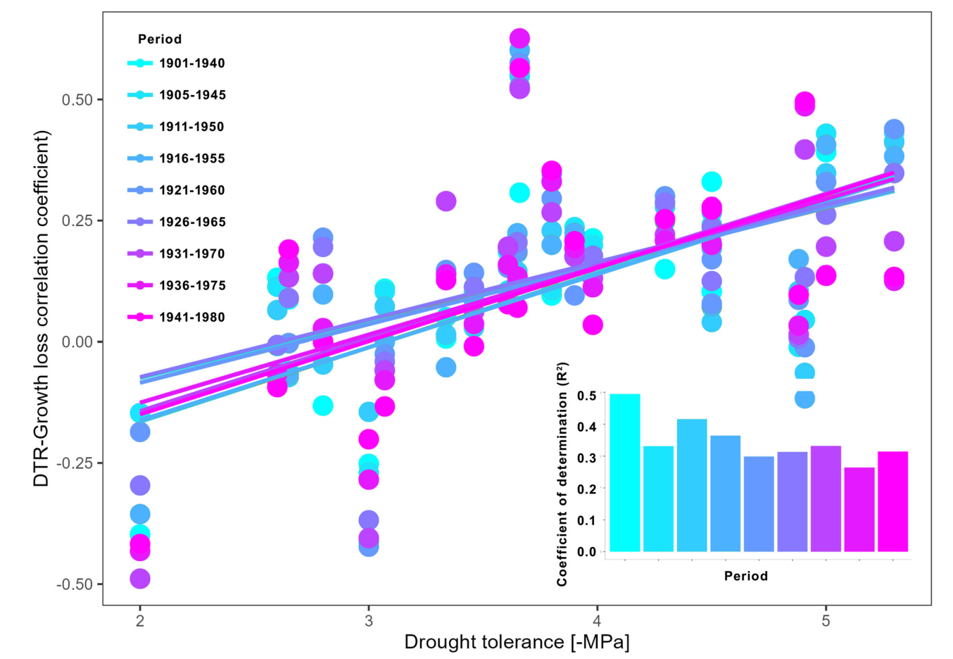 图 1. 昼夜温差与干旱导致的生长损失之间的相关系数与树种的抗旱性之间的关系随时间的变化