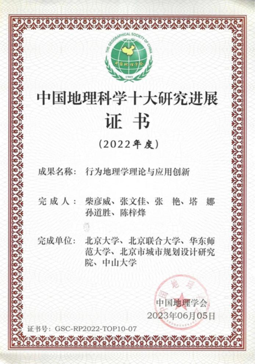 柴彦威教授领衔完成的“行为地理学理论与应用创新”成果 入选2022年度“中国地理科学十大研究进展”