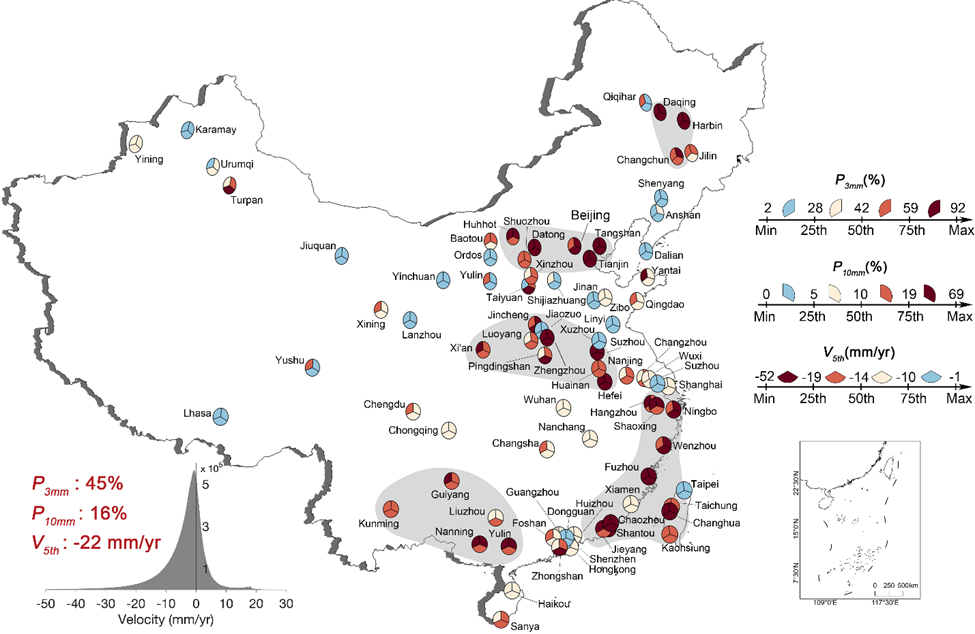 图1.我国大中型城市地面沉降的格局。图中每个圆圈表示一个城市,圆圈的三部分分别为三个沉降指标:所有沉降区域的面积比例(P3mm),沉降速率快于1厘米/年的区域面积比例(P10mm),以及城市内部所有地区的5分位数沉降速率(V5th)。灰色部分圈出了沉降速率相对较快的五个城市区域。左下图显示了三个指标在全国尺度(即所有城市综合考虑)的统计值