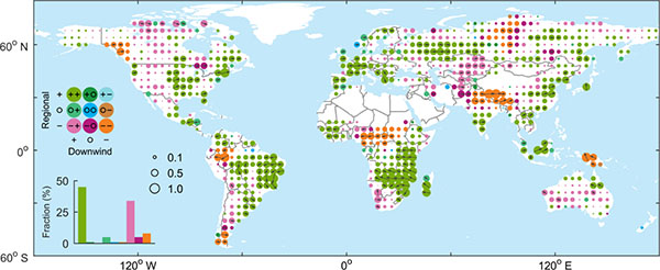 研究团队进一步聚焦当前全球大范围实施的植树造林工程的跨区域影响,研编了首幅全球植树造林综合水文效应格局图(图1)。令人鼓舞的是,研究发现全球陆地45%的区域(图1中绿色圆点),植树造林会同时利好当地和下风向地区的可用水量。这表明,在这些地区造林不仅促进碳汇,产生的水资源效益亦相当可观。然而,在水分限制地区和高海拔地区,植被增加则会导致当地和(或)下风向地区可用水量减少。