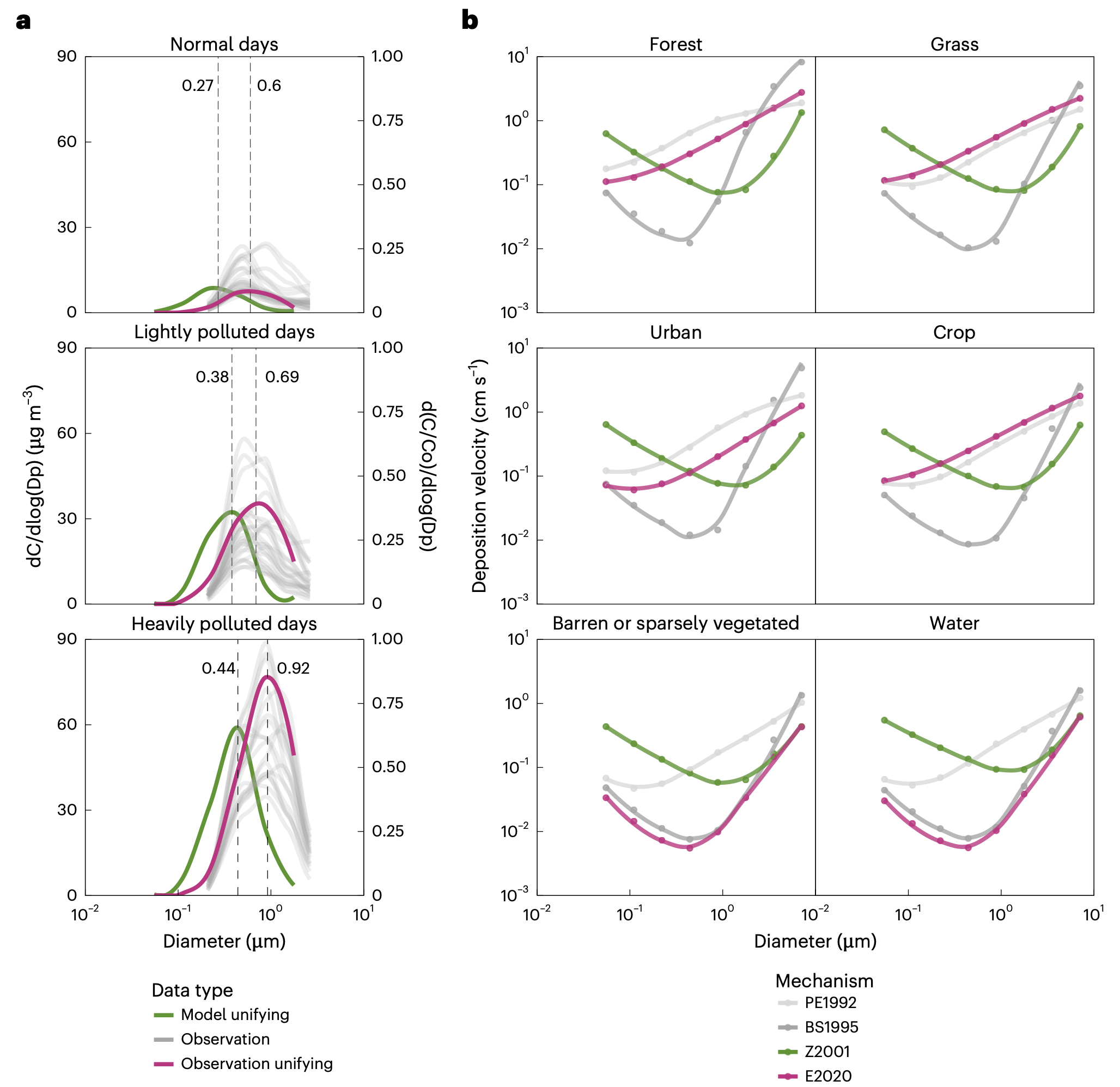 图1. 影响中国颗粒态氮干沉降估算的关键因素。a,颗粒态氮的粒径分布;b,不同干沉降机制下沉降速率随粒径的变化。