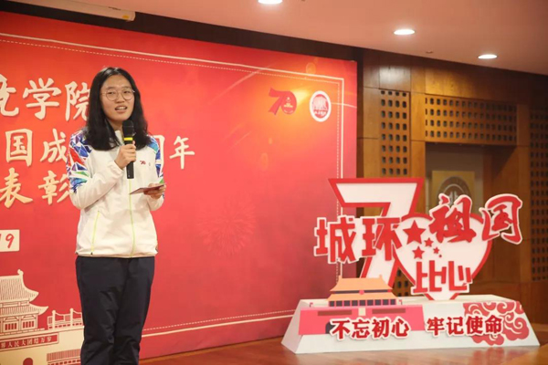 之后,几位不同身份的学生代表分别分享了自己与国庆重大活动的故事。作为志愿者代表,韩云凤、孙福月与师生分享了活动当日自己的经历与内心感受:庆典志愿者三点半出发,夜穿故宫,引导服务,虽身体劳累但精神充实;成就展志愿者虽未达庆典现场,但也在岗位上兢兢业业,为祖国庆生。替补成员万山铨虽最终没能走上长安街,但仍无怨无悔,为自己的使命感到骄傲。秦艳伟代表参加群众游行的同学们讲述了训练时的辛苦与欢乐,走过天安门前的激动与自豪。王浩舒分享了广场合唱成员用三个月里高强度、高密度的训练和合排,锤炼出同一种声音,为祖国歌唱、为时代的美好未来歌唱的经历。作为小队长,范晓琳回忆起自己与队员们相处的点点滴滴,在彼此的交流之中对北大和祖国的感情也愈发深厚。