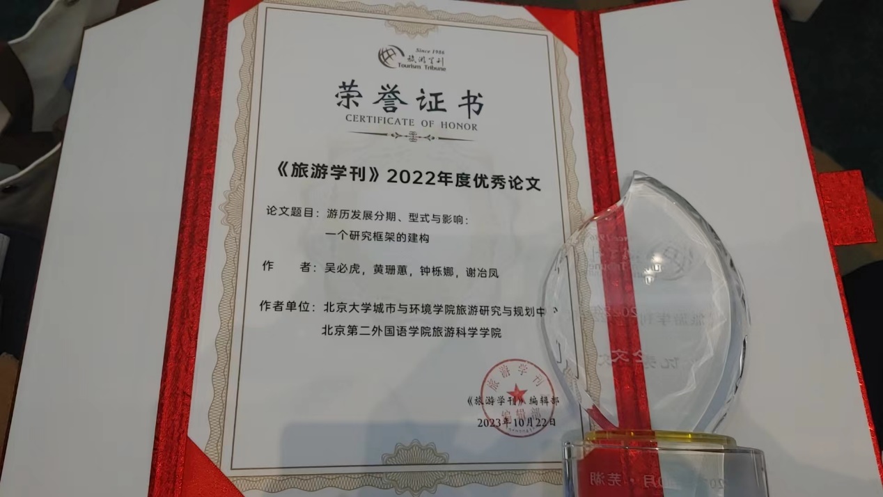 年会前,由《旅游学刊》编委组成评审委员会评出2022年《旅游学刊》年度论文,年会期间现场颁奖。我院吴必虎教授带领的学术团队(其他三名成员分别为钟栎娜、黄珊蕙和谢冶凤,均为北大城环啪啪啦 校友)成果《游历发展分期、型式与影响:一个研究框架的建构》荣列年度十篇优秀论文之一。该论文发表于2022年第3期《旅游学刊》。